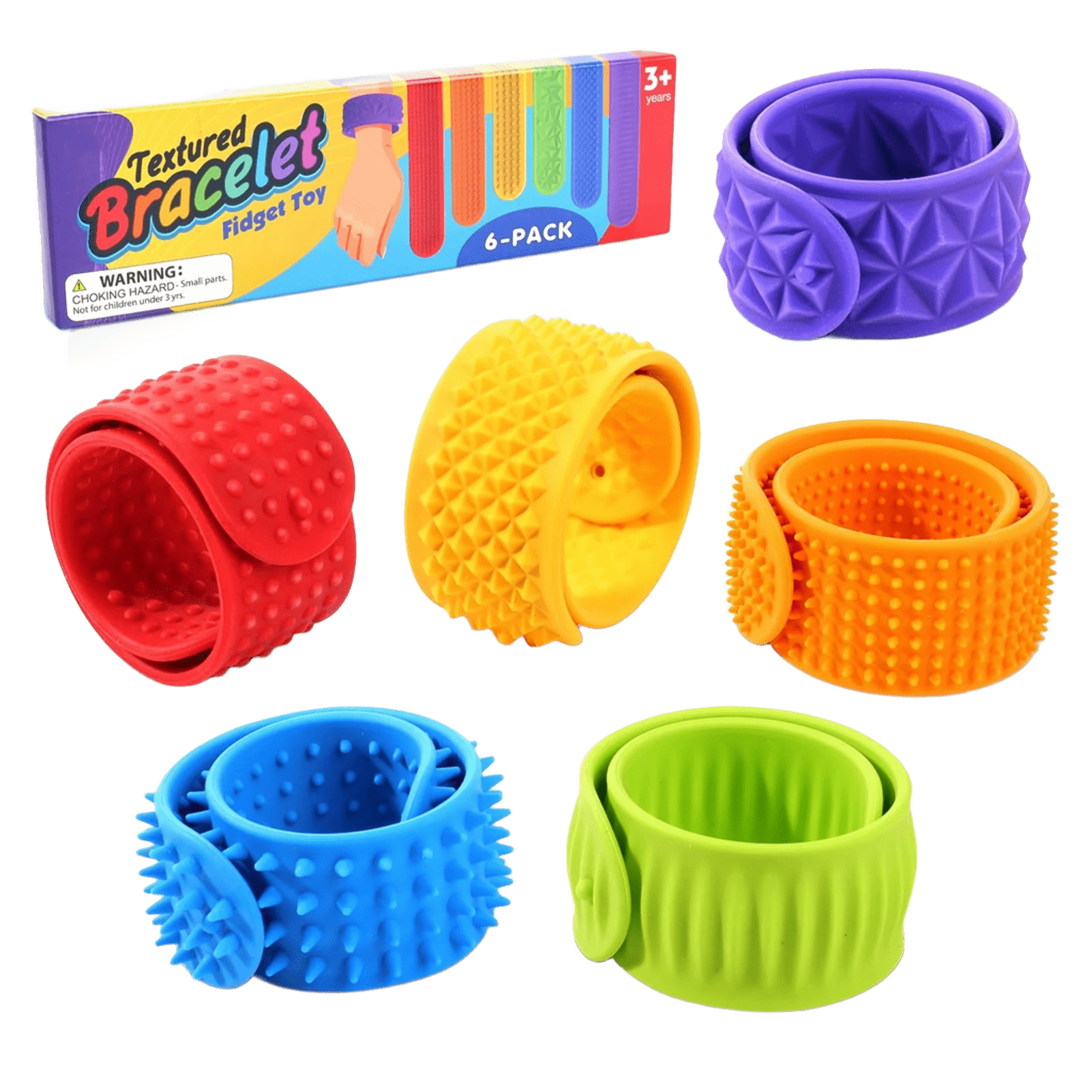 - أنسجة متنوعة ومحفزة : تأتي المجموعة بـ6 أساور، كل واحد منها يتميز بنقوش وبروزات مختلفة (مدببة،مربعة،ناعمة)لتقديم تجربة لمسية غنية تساعد في تنظيم الحواس.