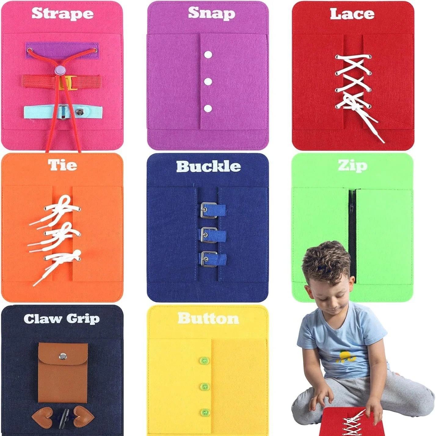 - إتقان المهارات اليومية : توفر الحقيبة 9 حيوية تشمل التعامل مع (السحابات – الأزرار – وتدريب ربط الحذاء لتمكين الطفل من ارتداء ملابسه وحذائه بشكل مستقل.
