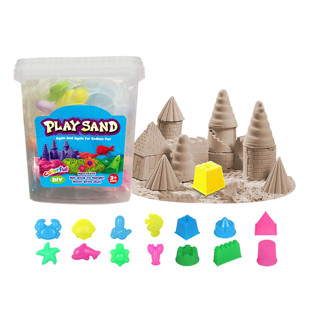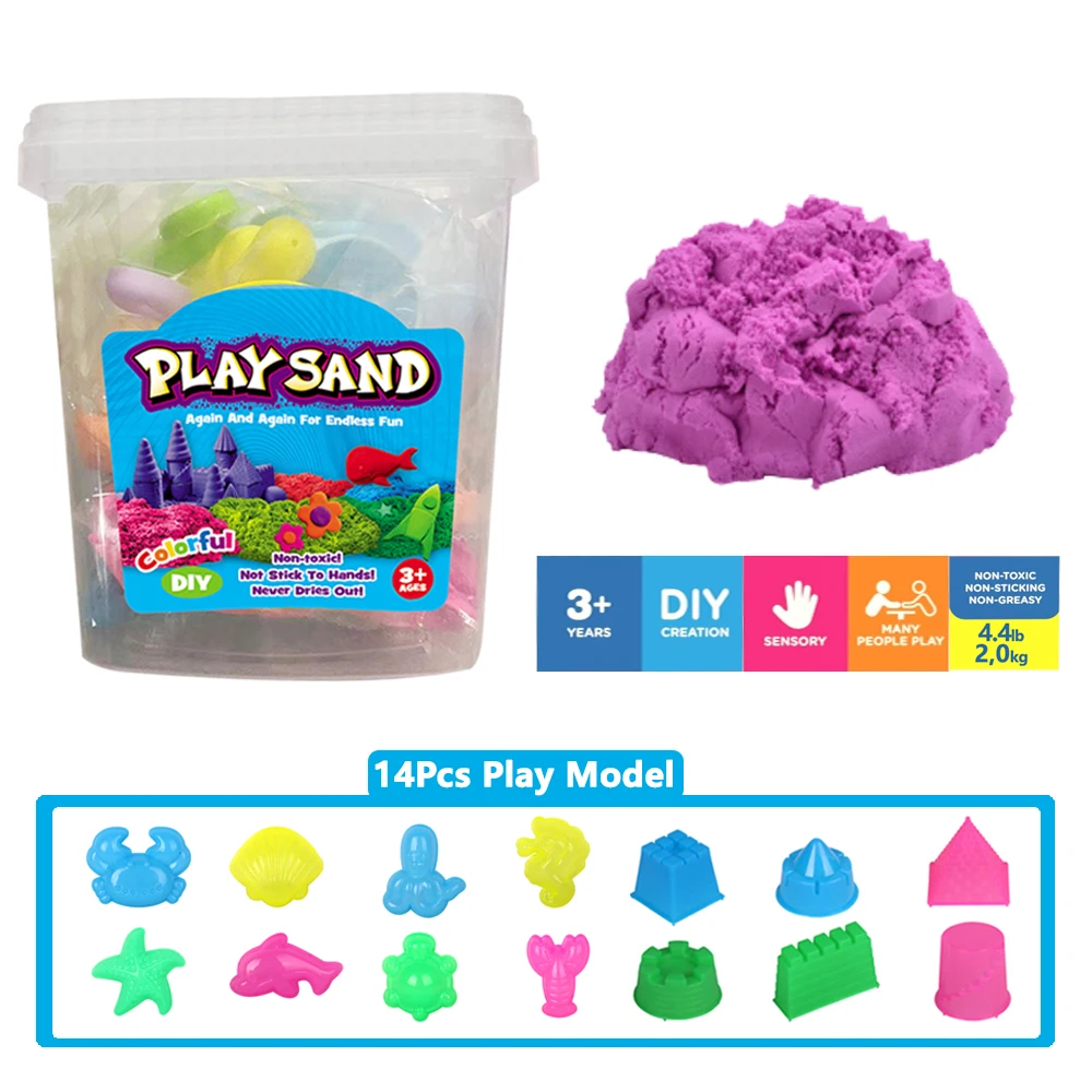 - مجموعة متكاملة : يأتي الرمل داخل دلو عملي للتخزين مع مجموعة غنية من القوالب الملونة (أصفر ، أخضر ، بنفسجي)لبناء مدينتهم الرملية الخاصة.